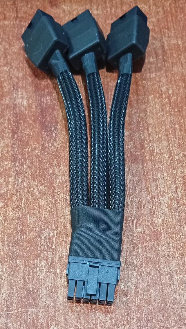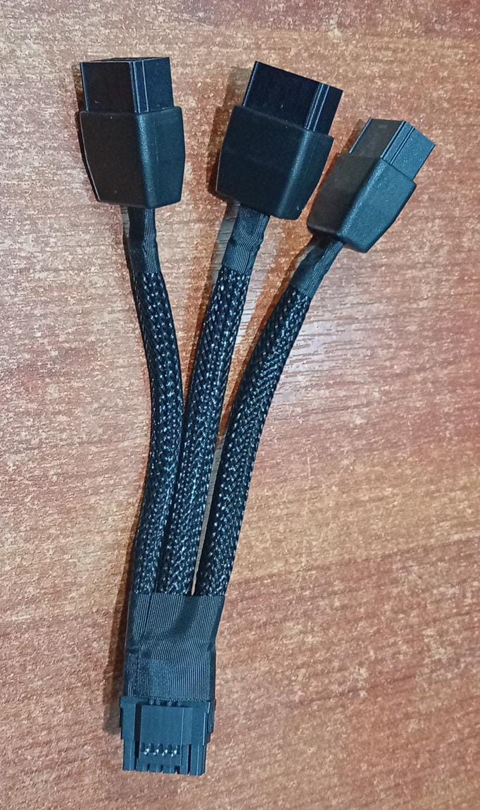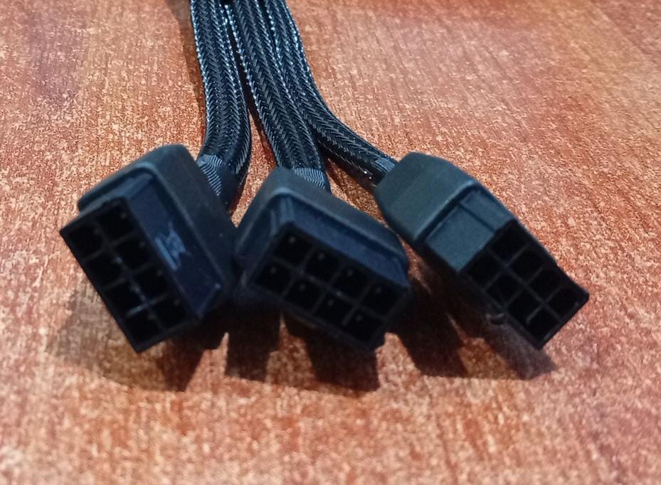 - Tres conectores de 8 pines PCIe en el otro extremo, que se conectan a la tarjeta gráfica.