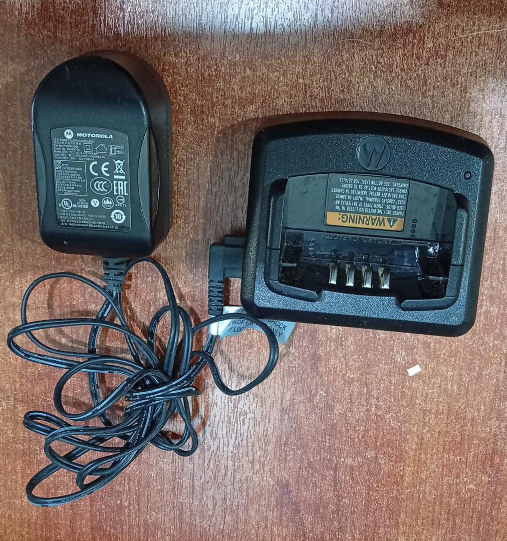 Cargador rápido Motorola original, seminuevo y probado, compuesto por base RLN6332A y adaptador de corriente PMPN4005A. Compatible con varios radios Motorola de las series CP110, RDX, RDU, RDV y modelos relacionados. Ideal como reemplazo original para mantener tus radios siempre listos para trabajo diario.