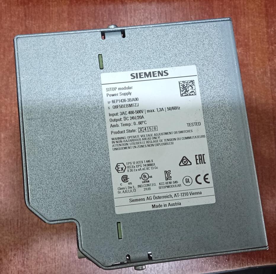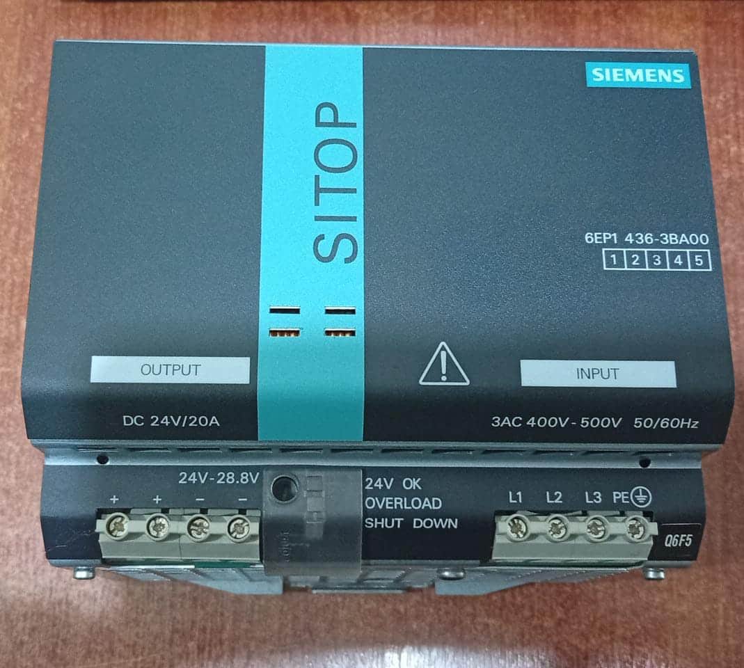 Fuente de alimentación industrial Siemens SITOP Modular modelo 6EP1436-3BA00, diseñada para sistemas de automatización y control. Entrega 24V DC y 20A con alta eficiencia y protección integrada. Ideal para PLC, tableros eléctricos y maquinaria industrial.