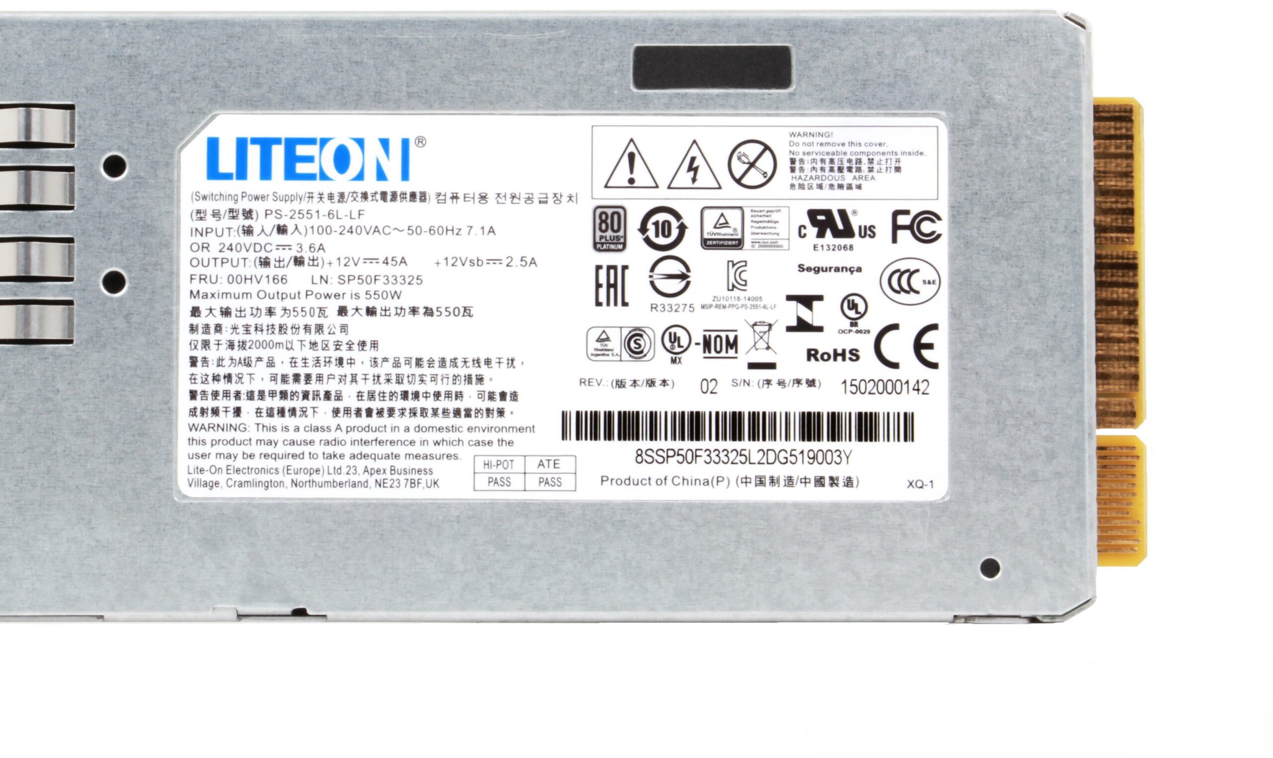 La LITEON PS-2551-6L-LF es una fuente de poder de 550W diseñada principalmente para servidores, como los modelos ThinkServer RD350, RD450, RD550 y RD650.