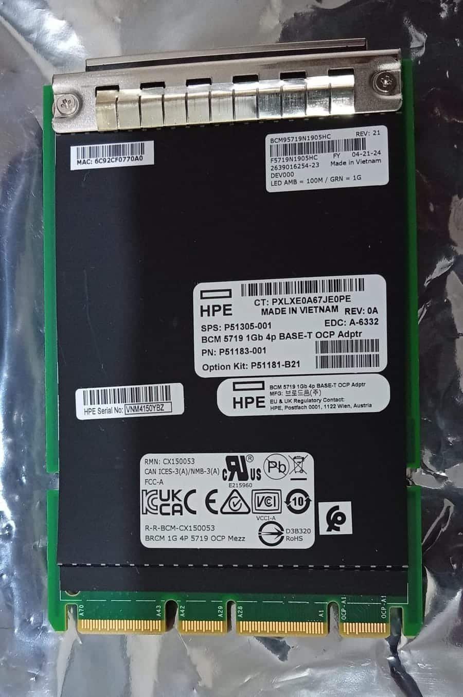 Tarjeta de red original HPE BCM5719 1Gb 4-Port BASE-T OCP Adapter, ideal para servidores HPE ProLiant Gen10 y Gen10 Plus.