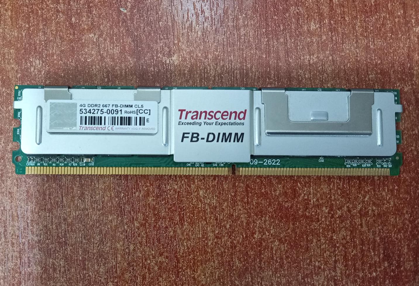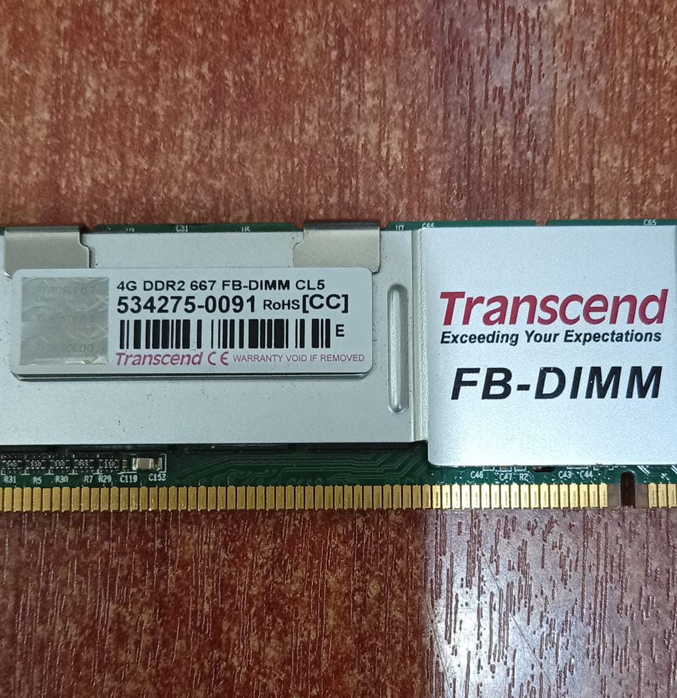 Módulo de memoria Transcend 4GB para servidores y estaciones de trabajo, tipo FB‑DIMM DDR2‑667 (PC2‑5300) con ECC y latencia CL5. Ideal para sistemas que requieren memoria buffered y confiable en entornos corporativos y de servidor.