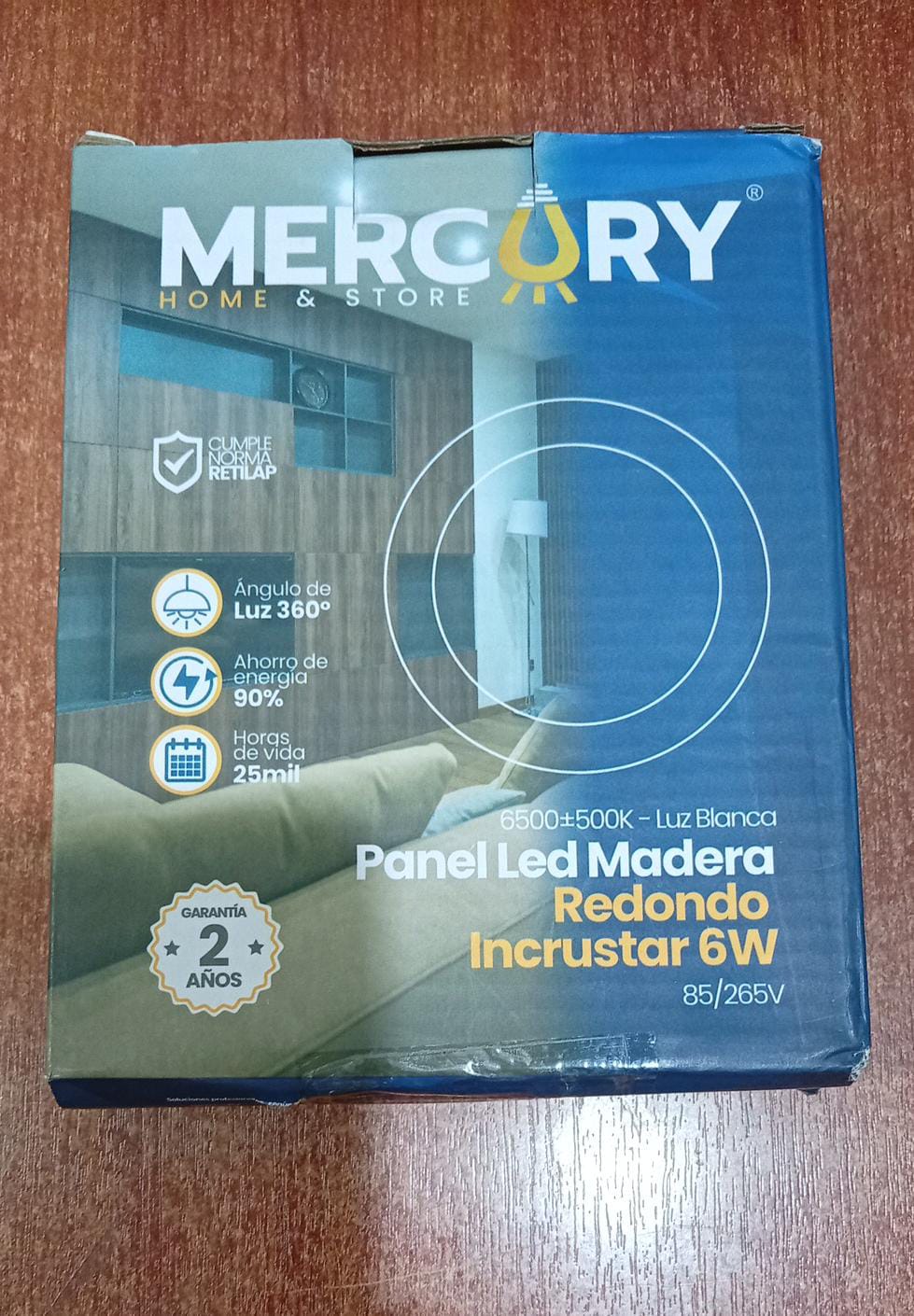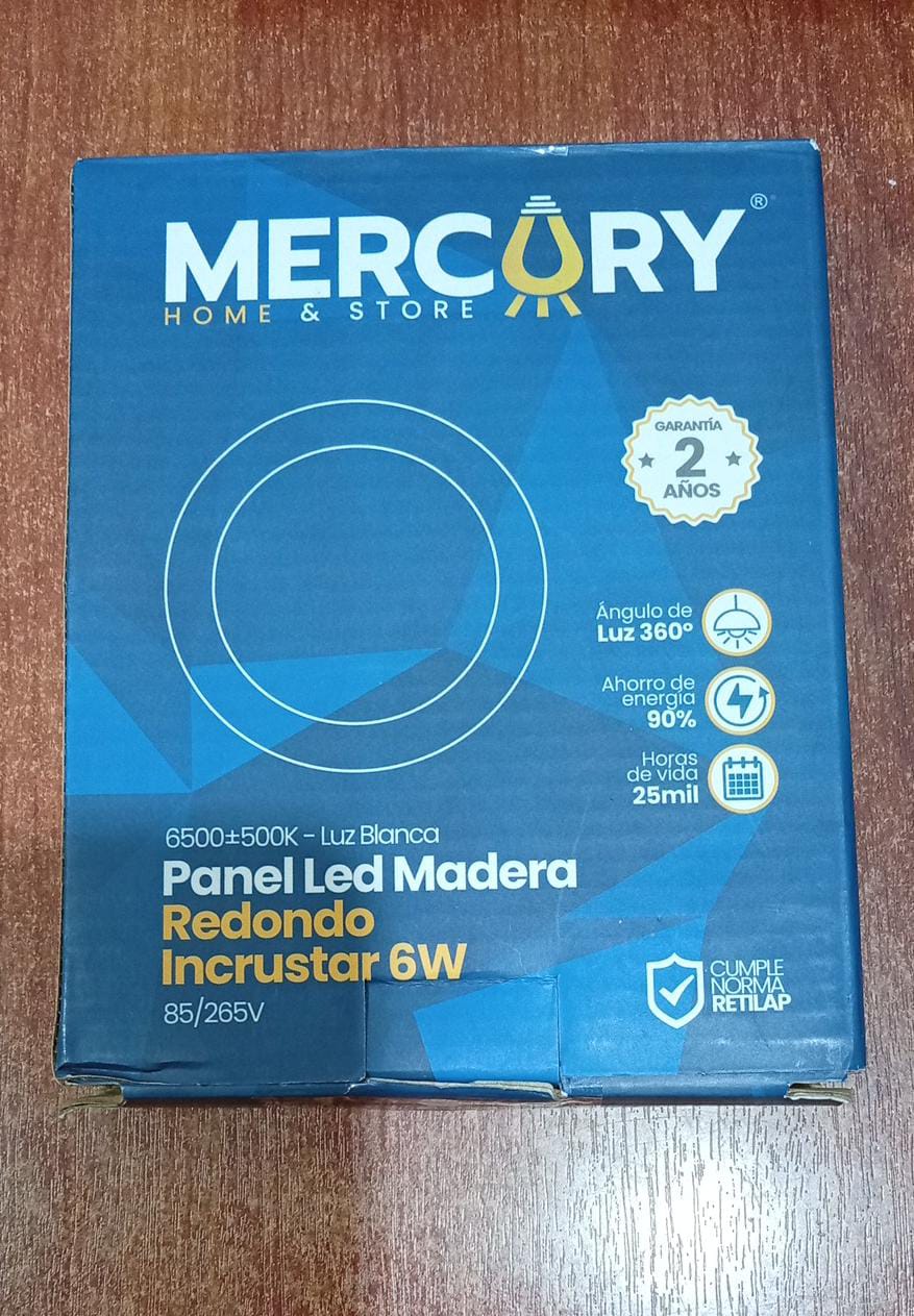 Panel LED redondo Mercury modelo IPL187 con acabado madera y diseño para empotrar. Iluminación eficiente de luz blanca fría 6500 K, bajo consumo y amplio rango de voltaje para uso en interiores residenciales o comerciales.