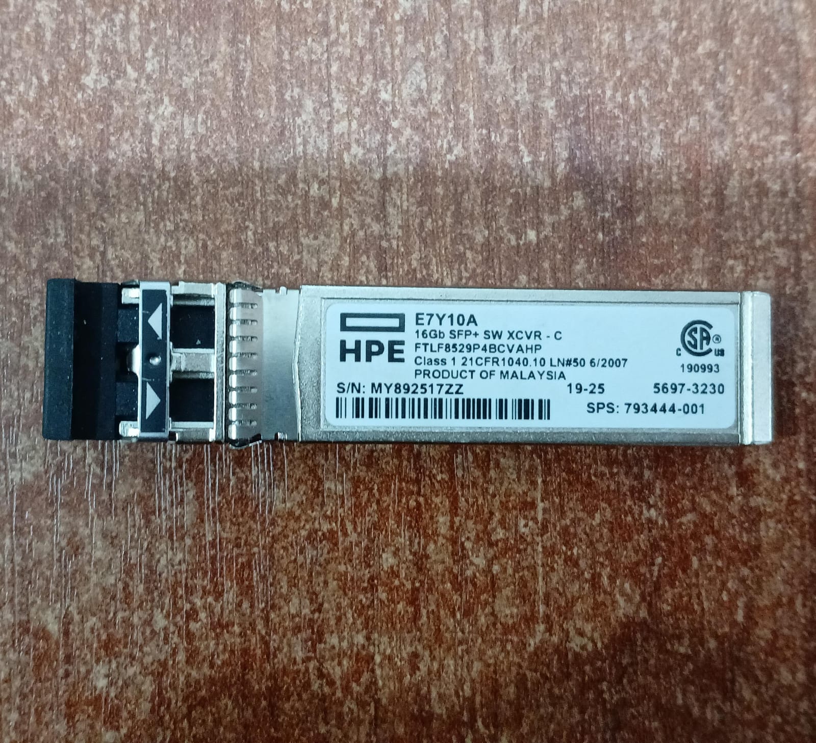El HPE E7Y10A (también conocido como SPS 793444-001) es un módulo transceptor SFP+ de onda corta de 16 GB diseñado para la transferencia de datos a alta velocidad en redes de canal de fibra.