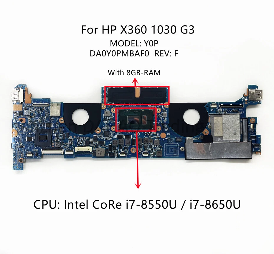 Placa madre original HP EliteBook x360 1030 G3, modelo DA0Y0PMBAF0 REV F (L31867‑601), con procesador Intel Core i7‑8650U, 8ª generación, 16 GB integrado, sin tarjeta gráfica dedicada. Ideal para reemplazo o reparación.