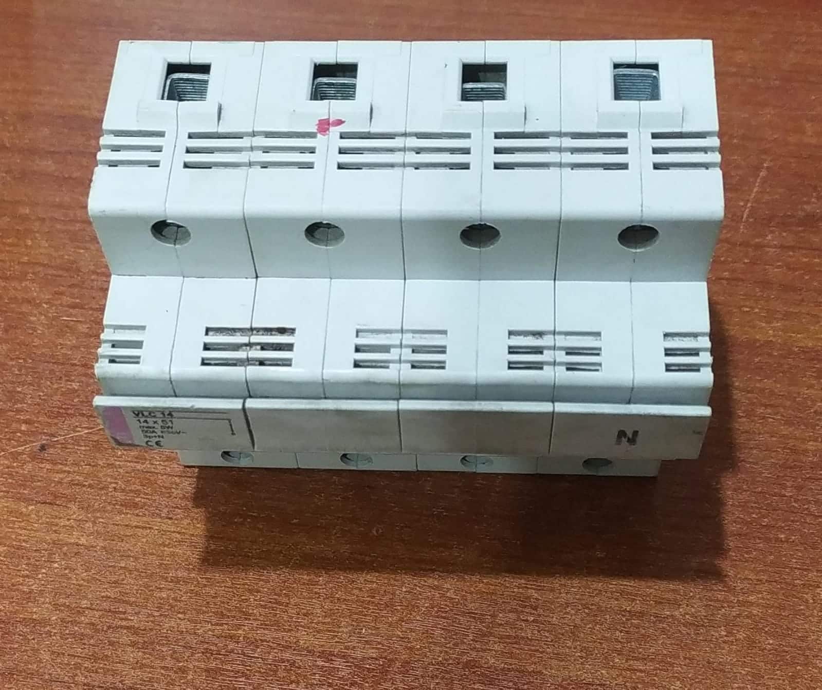 Porta-fusible modular Eaton VLC14-3P+N para fusibles cilíndricos de 14×51 mm. Soporta hasta 50 A y 690 V AC en configuración trifásica + neutro. Cumple norma IEC 60947-3.