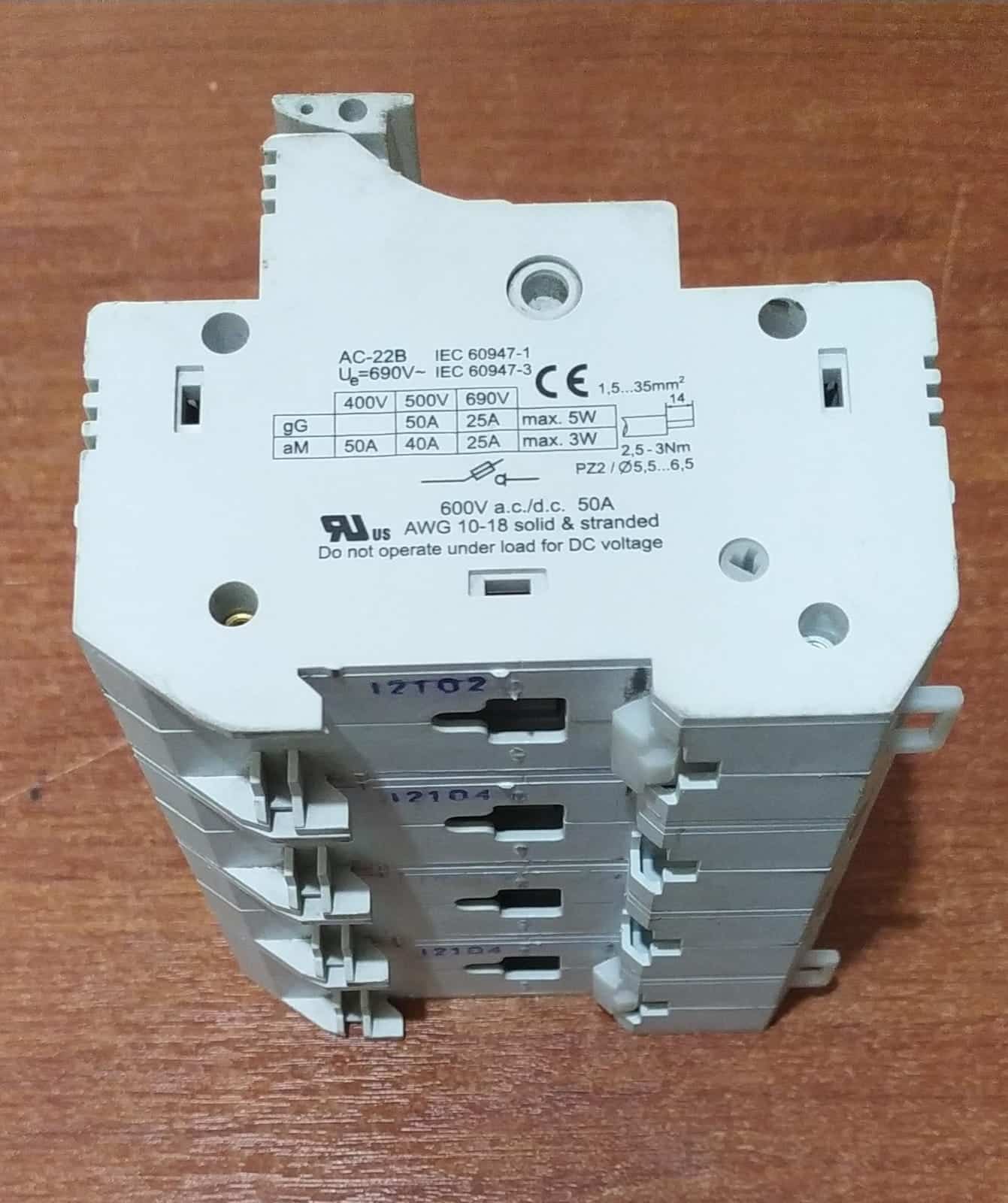 • Utilización gG: 400 V/50 A, 500 V/50 A, 690 V/25 A (max. 5 W)