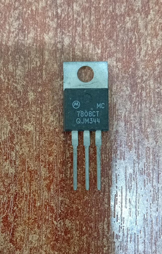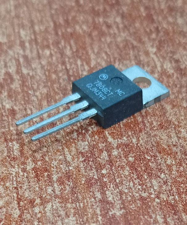 Regulador de voltaje lineal MC7808CT (TO‑220) que entrega 8 V y hasta 1 A, ideal para proyectos electrónicos y reparaciones de fuentes de poder o equipos que requieren tensión fija de 8 V. Voltaje de entrada máximo de 35V.